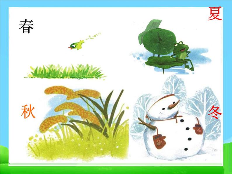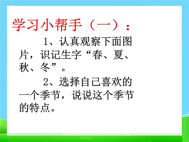学习小帮手(一): 1、认真观察下面图片,识记生字“春、夏、秋、冬”。 2、选择自己喜欢的一个季节,说说这个季节的特点。