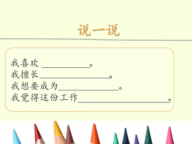 我喜欢 。 我擅长 。 我想要成为 。 我觉得这份工作 。