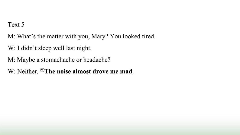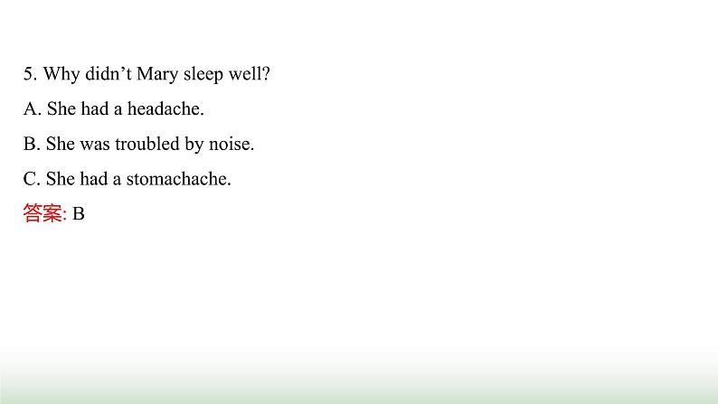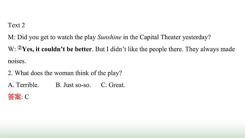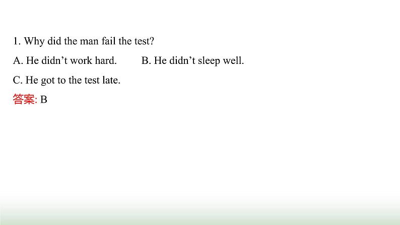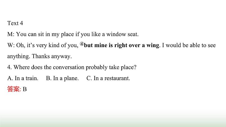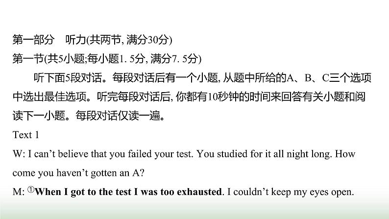 模块形成性评价(四)(Module 4)(120分钟 150分)第一部分 听力(共两节, 满分30分)第一节(共5小题;每小题1. 5分, 满分7. 5分) 听下面5段对话。每段对话后有一个小题, 从题中所给的A、B、C三个选项中选出最佳选项。听完每段对话后, 你都有10秒钟的时间来回答有关小题和阅读下一小题。每段对话仅读一遍。Text 1W: I can’t believe that you failed your test. You studied for it all night long. How come you haven’t gotten an A?M: ①When I got to the test I was too exhausted. I couldn’t keep my eyes open. 1. Why did the man fail the test?A. He didn’t work hard. B. He didn’t sleep well. C. He got to the test late. 答案: BText 2M: Did you get to watch the play Sunshine in the Capital Theater yesterday?W: ②Yes, it couldn’t be better. But I didn’t like the people there. They always made noises. 2. What does the woman think of the play?A. Terrible. B. Just so-so. C. Great. 答案: CText 3M: ③It’s raining again. The weather report says it’s going to snow tonight. I don’t like this kind of weather. W: But it’s going to be sunny this weekend. 3. What’s the weather like now?A. Snowy. B. Sunny. C. Rainy. 答案: CText 4M: You can sit in my place if you like a window seat. W: Oh, it’s very kind of you, ④but mine is right over a wing. I would be able to see anything. Thanks anyway. 4. Where does the conversation probably take place?A. In a train. B. In a plane. C. In a restaurant. 答案: BText 5M: What’s the matter with you, Mary? You looked tired. W: I didn’t sleep well last night. M: Maybe a stomachache or headache?W: Neither. ⑤The noise almost drove me mad. 5. Why didn’t Mary sleep well?A. She had a headache. B. She was troubled by noise. C. She had a stomachache. 答案: B第二节(共15小题;每小题1. 5分, 满分22. 5分) 听下面5段对话或独白。每段对话或独白后有几个小题, 从题中所给的A、B、C三个选项中选出最佳选项。听每段对话或独白前, 你将有时间阅读各个小题, 每小题5秒钟;听完后, 各小题将给出5秒钟的作答时间。每段对话或独白读两遍。听第6段材料, 回答第6、7题。Text 6W: Hey, Peter. I’m sorry!M: Hi, Diana. What’s wrong?W: ⑥We were going to Hong Kong this weekend, but I’m afraid I can’t go. M: How come?W: I have a really big geography test and I have to study for it. M: We can go next week instead. W: No, I don’t want to ruin your weekend. ⑦You go ahead and please take the book I bought to my friend Sally. Tell her I have to study all the weekend, because I can’t afford to fail the test. M: OK, then I’ll go with Dan. But it’s a pity you can’t come. 6. Why does Diana say sorry to Peter?A. She has to give up her travel plan. B. She wants to visit another city. C. She needs to put off her test. 答案: A7. What does Diana want Peter to do?A. Help her with her study. B. Take a book to her friend. C. Teach a geography lesson. 答案: B听第7段材料, 回答第8~10题。Text 7W: Hello, this is Andrea. M: Hello, Andrea, this is Alex. I have some very good news for you. Miranda was very satisfied with you and said she’s very much looking forward to working with you. Isn’t that wonderful? ⑧Congratulations, dear! How does it feel to be Miranda’s new assistant?I imagine that you’re just delighted with the news. So, let’s see. . . you can start on Monday, right?W: Um, well, I don’t think I can start on Monday. ⑩I am visiting my father in Baltimore. And because I don’t live in New York, ⑨I’ll need a couple of days to find a flat and buy some furniture and move my things from Avon. M: Oh, well. . . then, in that case I suppose Wednesday would be good. OK, see you then!8. Why does the man call the woman?A. To tell her about her new job. B. To ask about her job program. C. To plan a meeting with her. 答案: A9. Who needs a new flat?A. Alex. B. Miranda. C. Andrea. 答案: C10. Where is the woman now?A. In Baltimore. B. In New York. C. In Avon. 答案: A听第8段材料, 回答第11~13题。Text 8M: Good morning. Can I see your membership card, please?W: Well, I’m actually here to join the book club today. M: I’m really sorry. There is something wrong with the computer. ⑪If you can come back on Monday—that’s tomorrow—we can sign you up then. And we have a discount on Mondays and Tuesdays. W: Oh, ⑫but I have to see the dentist tomorrow, and I have a meeting to attend on Tuesday. M: In that case, you can leave your information on this piece of paper and I’ll put your application into the computer tomorrow. W: Oh, that’s wonderful!M: ⑬Which membership would you like: a one-year membership, a three-year membership, or a lifetime membership?There is a special gift for the lifetime membership. W: Let me see. I think a one-year membership is right for me. 11. What day is it today?A. Monday. B. Tuesday. C. Sunday. 答案: C12. What is the woman planning to do tomorrow?A. See her dentist. B. Attend a meeting. C. Join the book club. 答案: A13. How many kinds of membership cards are mentioned by the man?A. Two. B. Three. C. Four. 答案: B听第9段材料, 回答第14~17题。Text 9M: I have such a busy day today. I don’t know when I’ll be home. Can you pick up our son from school today?W: Oh, you have to speak at the High School of Science and Technology today?M: That’ll be finished by 3 o’clock. ⑭But then I have to go to the office and prepare my notes for my speech at the Computer Society’s annual dinner tonight. W: Well, at least your magazine article has already been written and given to your editor. It was due today, wasn’t it?M: Yes, at least that’s done. ⑮In fact, it should be published sometime next month. W: Do you think you’ll be given time to eat tonight or will you have to spend the entire evening answering questions?M: I might be asked to speak as soon as everyone sits down for dinner. ⑯In that case, I g