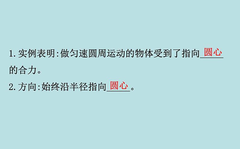 1.实例表明:做匀速圆周运动的物体受到了指向_____的合力。2.方向:始终沿半径指向_____。