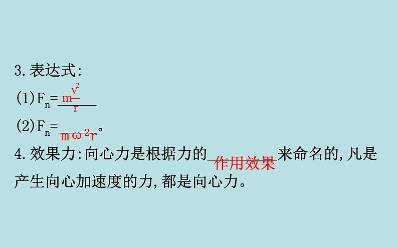 3.表达式:(1)Fn=_____ (2)Fn=_____。4.效果力:向心力是根据力的_________来命名的,凡是产生向心加速度的力,都是向心力。
