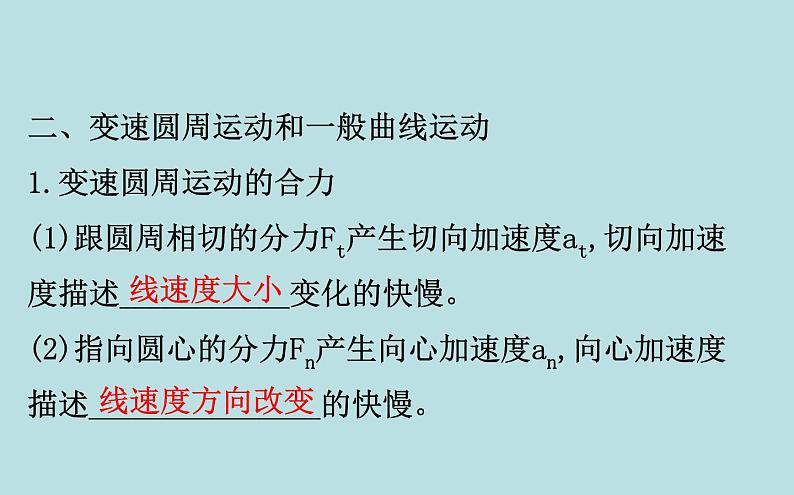 二、变速圆周运动和一般曲线运动1.变速圆周运动的合力(1)跟圆周相切的分力Ft产生切向加速度at,切向加速度描述___________变化的快慢。(2)指向圆心的分力Fn产生向心加速度an,向心加速度描述_______________的快慢。