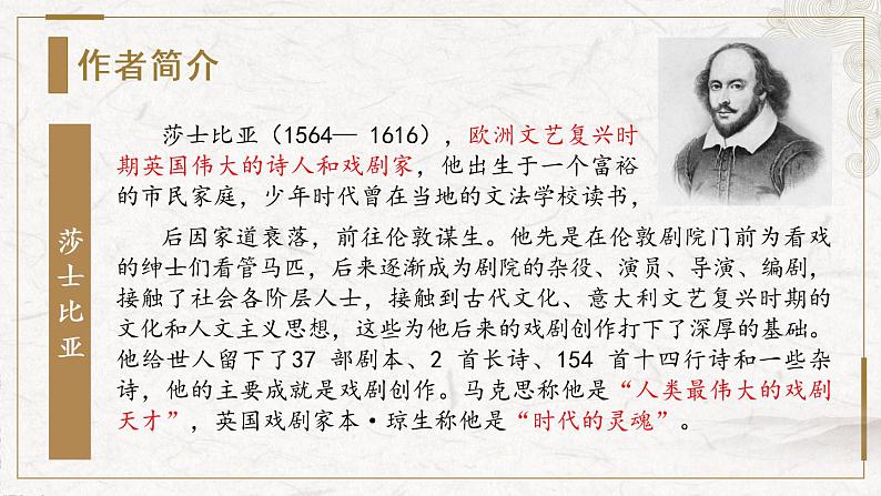 后因家道衰落,前往伦敦谋生。他先是在伦敦剧院门前为看戏的绅士们看管马匹,后来逐渐成为剧院的杂役、演员、导演、编剧,接触了社会各阶层人士,接触到古代文化、意大利文艺复兴时期的文化和人文主义思想,这些为他后来的戏剧创作打下了深厚的基础。他给世人留下了37 部剧本、2 首长诗、154 首十四行诗和一些杂诗,他的主要成就是戏剧创作。马克思称他是“人类最伟大的戏剧天才”,英国戏剧家本·琼生称他是“时代的灵魂”。