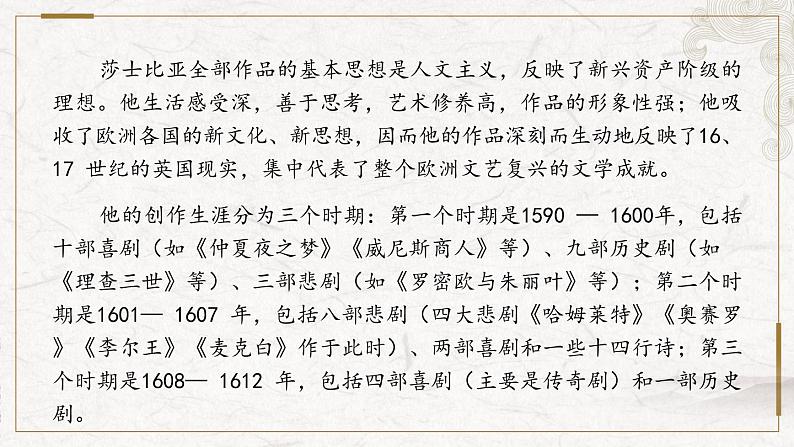 莎士比亚全部作品的基本思想是人文主义,反映了新兴资产阶级的理想。他生活感受深,善于思考,艺术修养高,作品的形象性强;他吸收了欧洲各国的新文化、新思想,因而他的作品深刻而生动地反映了16、17 世纪的英国现实,集中代表了整个欧洲文艺复兴的文学成就。他的创作生涯分为三个时期:第一个时期是1590 — 1600年,包括十部喜剧(如《仲夏夜之梦》《威尼斯商人》等)、九部历史剧(如《理查三世》等)、三部悲剧(如《罗密欧与朱丽叶》等);第二个时期是1601— 1607 年,包括八部悲剧(四大悲剧《哈姆莱特》《奥赛罗》《李尔王》《麦克白》作于此时)、两部喜剧和一些十四行诗;第三个时期是1608— 1612 年,包括四部喜剧(主要是传奇剧)和一部历史剧。