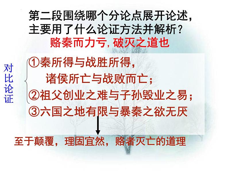 ①秦所得与战胜所得, 诸侯所亡与战败而亡;②祖父创业之难与子孙毁业之易;③六国之地有限与暴秦之欲无厌