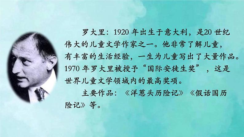 展开罗大里:1920 年出生于意大利,是20 世纪伟大的儿童文学作家之一。他非常了解儿童,有丰富的生活经验,一生为儿童写出了大量作品。1970 年罗大里被授予“国际安徒生奖” ,这是世界儿童文学领域内的最高奖项。主要作品:《洋葱头历险记》《假话国历险记》等。