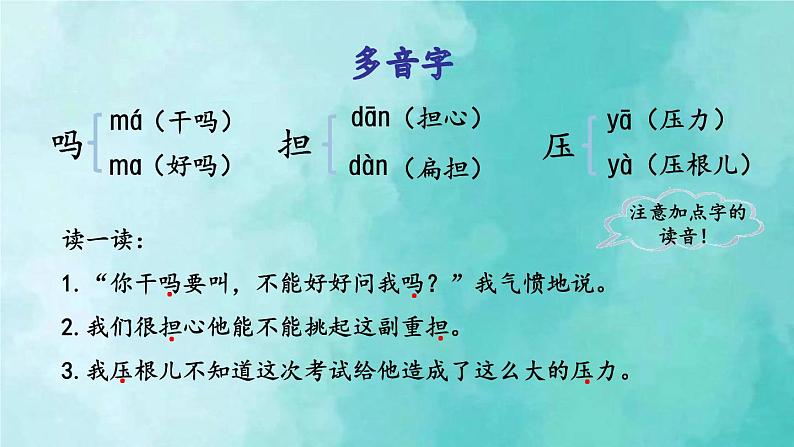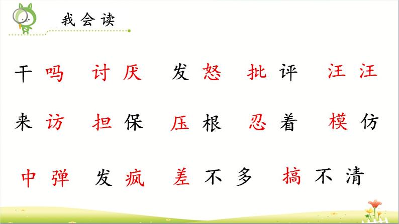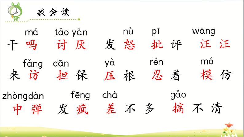 拓展练习1.把加点字的音节补充完整。f___疯狂 n___发怒 ___ěn忍着g___搞错 y___讨厌 f___访问2.比一比,组成词语。漂(________) 晒(________) 抱(________) 饿(________)票(________) 洒(________) 饱(________) 我(________)3.猜谜语 走起路来落梅花,从早到晚守着家,看见生人就想咬,见了主人摇尾巴。_______________________________________________