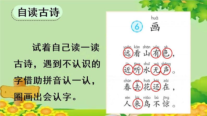 试着自己读一读古诗,遇到不认识的字借助拼音认一认,圈画出会认字。