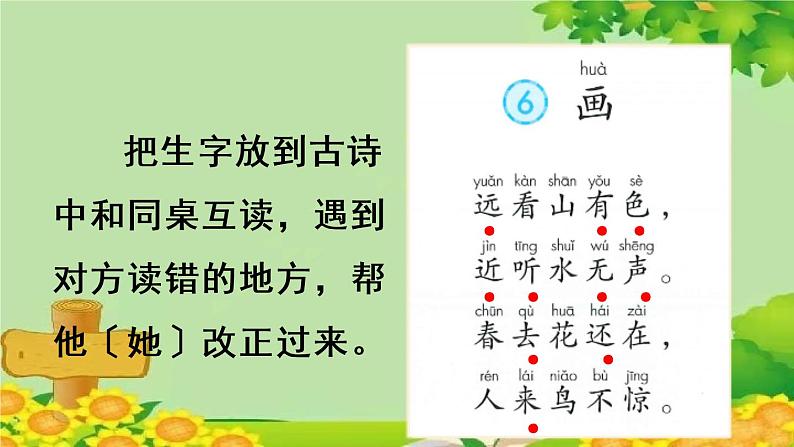把生字放到古诗中和同桌互读,遇到对方读错的地方,帮他〔她〕改正过来。