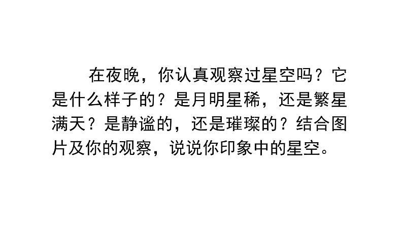 展开在夜晚,你认真观察过星空吗?它是什么样子的?是月明星稀,还是繁星满天?是静谧的,还是璀璨的?结合图片及你的观察,说说你印象中的星空。