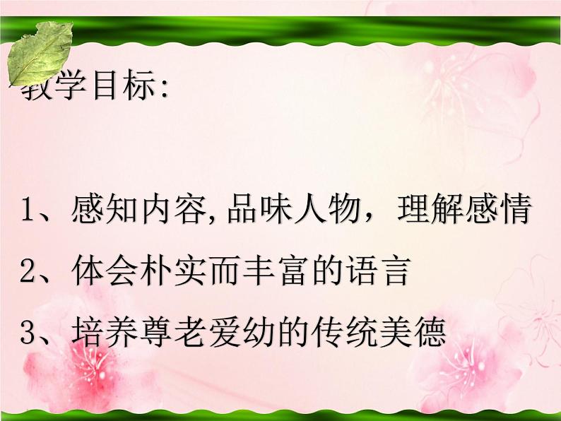 教学目标:1、感知内容,品味人物,理解感情2、体会朴实而丰富的语言3、培养尊老爱幼的传统美德