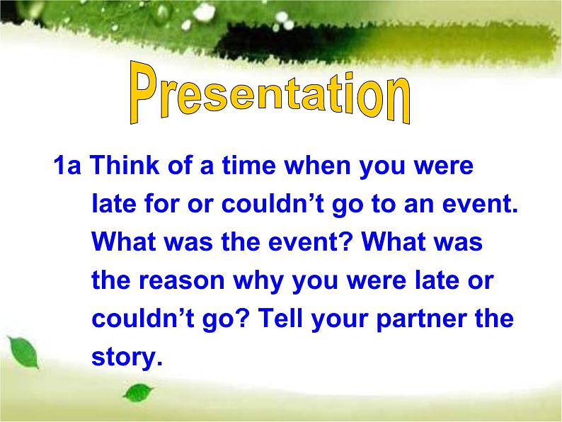 1a Think f a time when yu were late fr r culdn’t g t an event. What was the event? What was the reasn why yu were late r culdn’t g? Tell yur partner the stry.