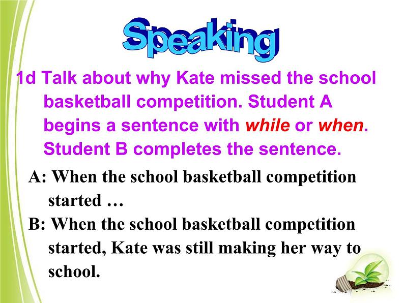 1d Talk abut why Kate missed the schl basketball cmpetitin. Student A begins a sentence with while r when. Student B cmpletes the sentence.