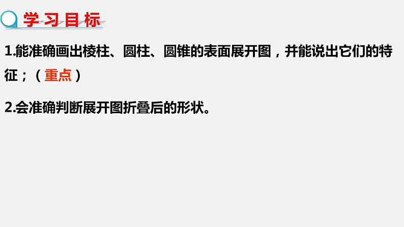 展开1.能准确画出棱柱、圆柱、圆锥的表面展开图,并能说出它们的特征;(重点)2.会准确判断展开图折叠后的形状。