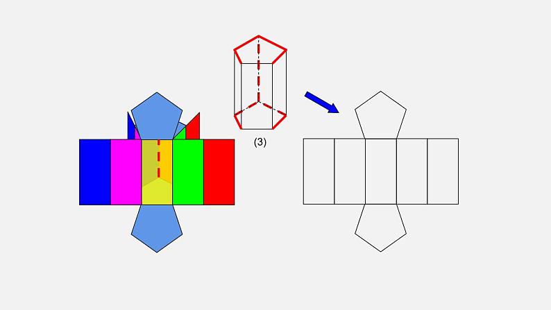 总结:1.棱柱的表面展开图是由两个相同的多边形和一些长方形组成的.2.棱柱的表面展开图不止一种,沿其不同的棱剪开,可得到不同的表面展开图.