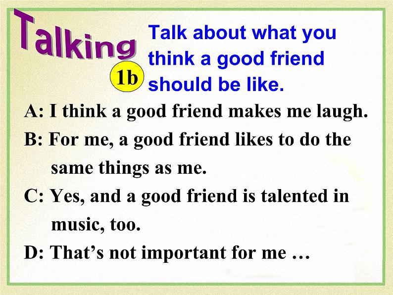 A: I think a gd friend makes me laugh. B: Fr me, a gd friend likes t d the same things as me. C: Yes, and a gd friend is talented in music, t.D: That’s nt imprtant fr me …