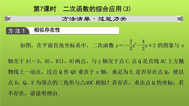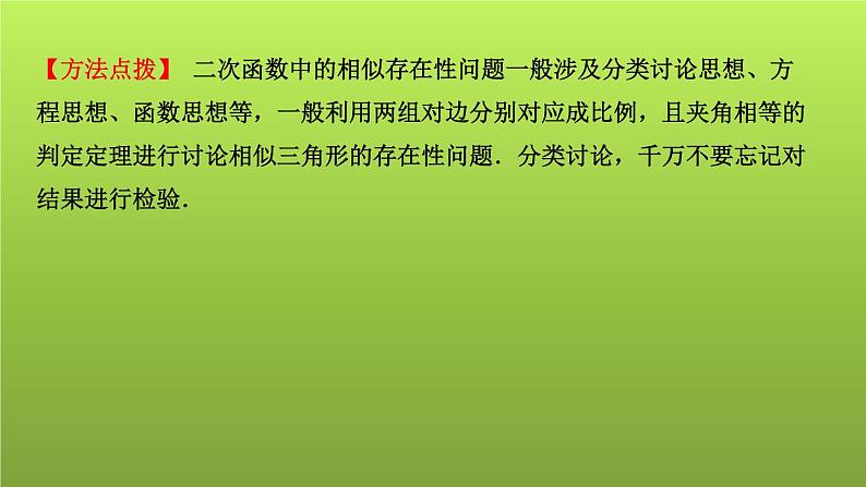 展开【方法点拨】 二次函数中的相似存在性问题一般涉及分类讨论思想、方程思想、函数思想等,一般利用两组对边分别对应成比例,且夹角相等的判定定理进行讨论相似三角形的存在性问题.分类讨论,千万不要忘记对结果进行检验.