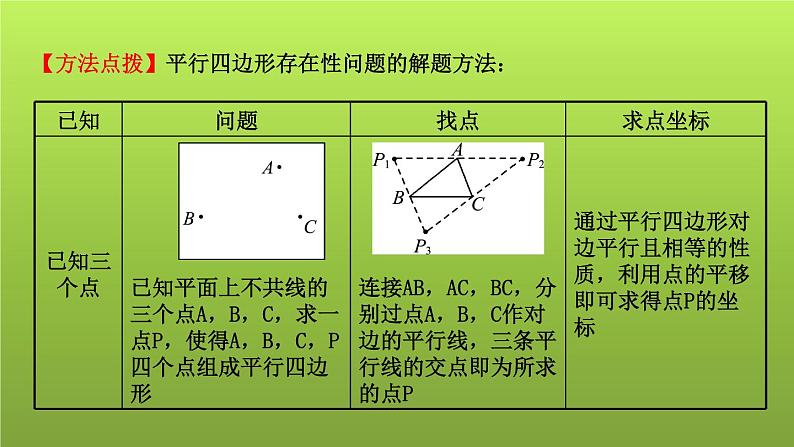 【方法点拨】平行四边形存在性问题的解题方法: