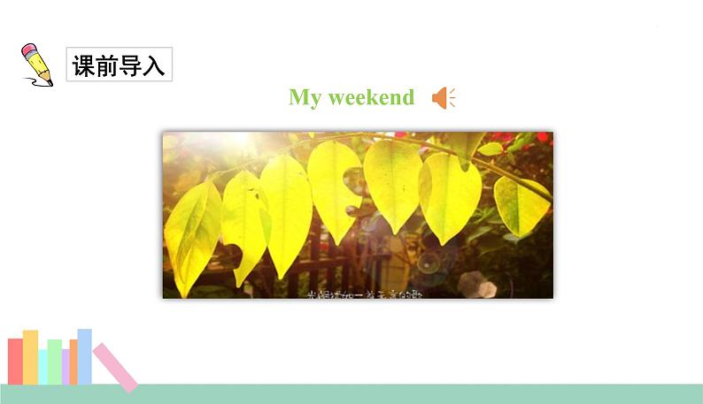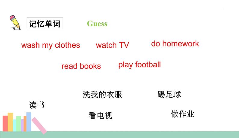这是一份英语五年级上册Unit 2 My week Part B课前预习ppt课件,共23页。PPT课件主要包含了My weekend,课前导入,New words,单词卡,Guess,watch TV ,看电视,踢足球,做作业,洗我的衣服等内容,欢迎下载使用。