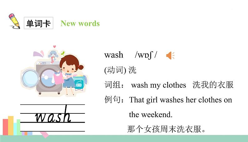 wash /wɒʃ / (动词) 洗词组: wash my clthes 洗我的衣服例句:That girl washes her clthes n the weekend. 那个女孩周末洗衣服。