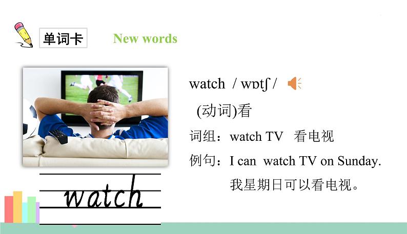 watch / wɒtʃ / (动词)看词组:watch TV 看电视例句:I can watch TV n Sunday. 我星期日可以看电视。