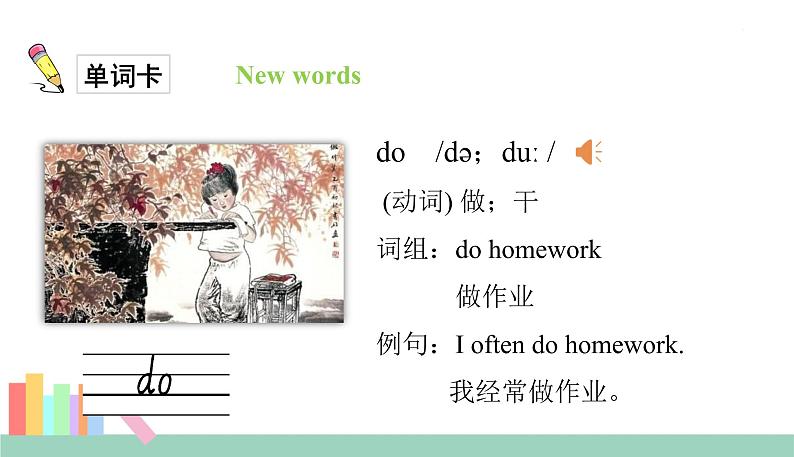 d /də;duː / (动词) 做;干 词组:d hmewrk 做作业例句:I ften d hmewrk. 我经常做作业。