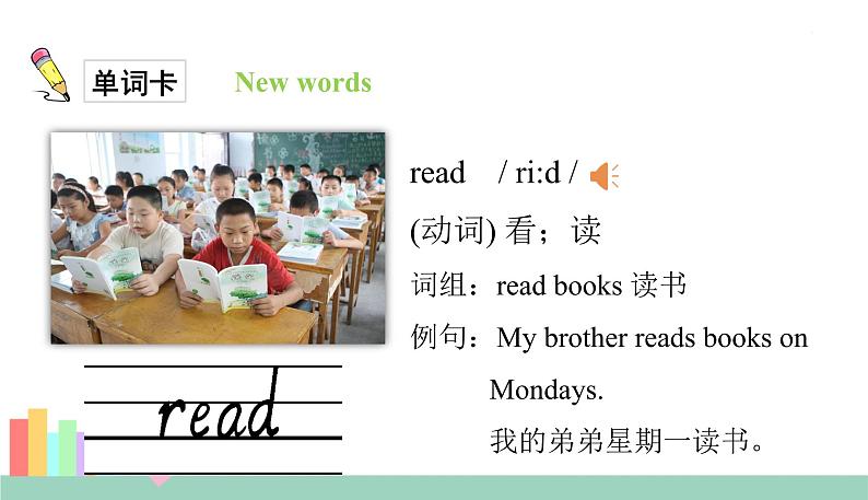 read / ri:d /(动词) 看;读 词组:read bks 读书例句:My brther reads bks n Mndays. 我的弟弟星期一读书。