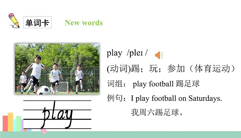 play /pleɪ / (动词)踢;玩;参加(体育运动)词组: play ftball 踢足球例句:I play ftball n Saturdays. 我周六踢足球。