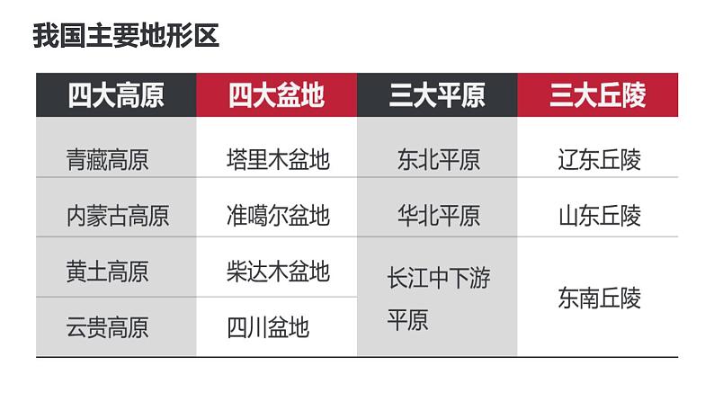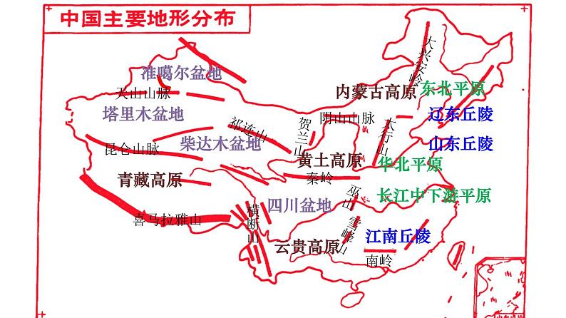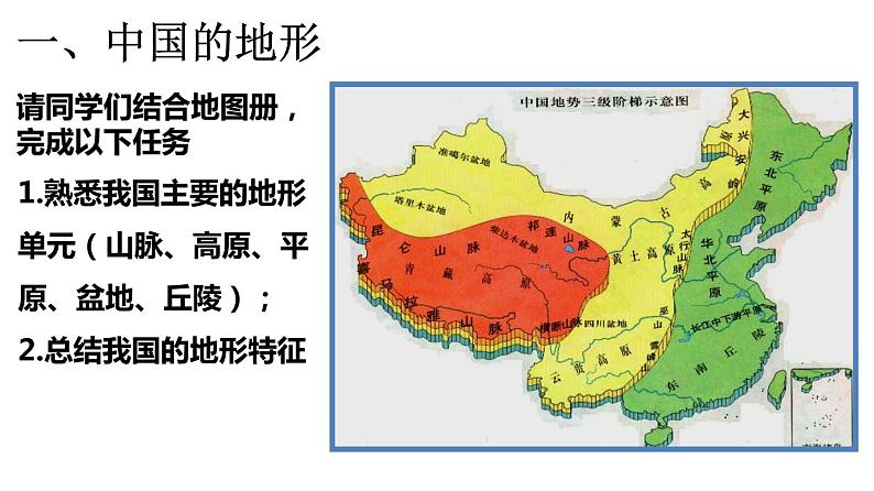1.熟悉我国主要的地形单元(山脉、高原、平原、盆地、丘陵);2.总结我国的地形特征