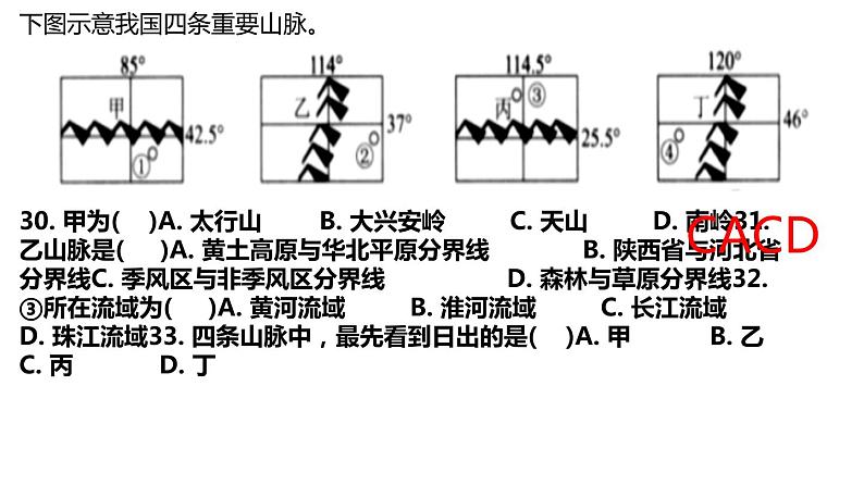 30. 甲为( )A. 太行山 B. 大兴安岭 C. 天山 D. 南岭31. 乙山脉是( )A. 黄土高原与华北平原分界线 B. 陕西省与河北省分界线C. 季风区与非季风区分界线 D. 森林与草原分界线32. ③所在流域为( )A. 黄河流域 B. 淮河流域 C. 长江流域 D. 珠江流域33. 四条山脉中,最先看到日出的是( )A. 甲 B. 乙 C. 丙 D. 丁