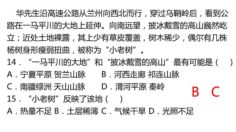 华先生沿高速公路从兰州向西北而行,穿过乌鞘岭后,看到公路在一马平川的大地上延伸。向南远望,披冰戴雪的高山巍然屹立;近处土地裸露,其上少有草皮覆盖,树木稀少,偶尔有几株杨树身形瘦弱扭曲,被称为“小老树”。14.“一马平川的大地”和“披冰戴雪的高山”最有可能是( )A.宁夏平原 贺兰山脉B.河西走廊 祁连山脉C.南疆绿洲 天山山脉D.渭河平原 秦岭15.“小老树”反映了该地( )A.热量不足B.土层稀薄C.气候干旱D.光照不足