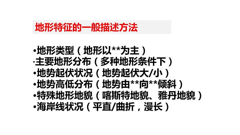 ·地形类型(地形以**为主)·主要地形分布(多种地形条件下)·地势起伏状况(地势起伏大/小)·地势高低分布(地势由**向**倾斜)·特殊地形地貌(喀斯特地貌、雅丹地貌)·海岸线状况(平直/曲折,漫长)