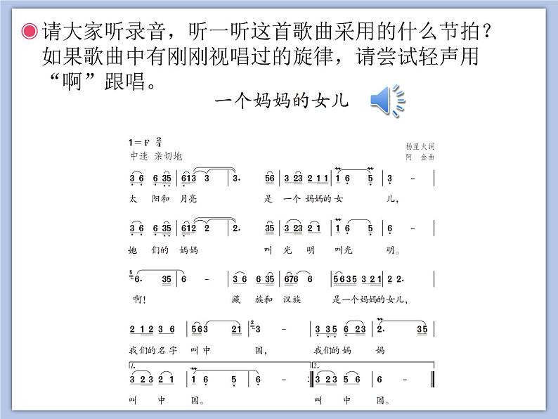 请大家听录音,听一听这首歌曲采用的什么节拍?如果歌曲中有刚刚视唱过的旋律,请尝试轻声用“啊”跟唱。