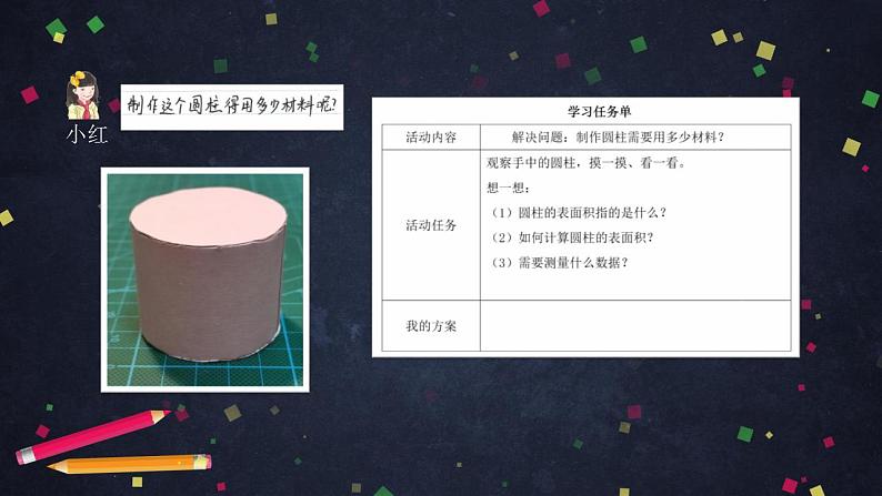 《圆柱的表面积(一)》学习任务单【课前准备】 上节课课后作业布置的制作一个圆柱。 【课上活动】活动一: 活动内容解决问题:制作圆柱需要用多少材料?活动任务观察手中的圆柱,摸一摸、看一看。想一想:(1)圆柱的表面积指的是什么?(2)如何计算圆柱的表面积?(3)需要测量什么数据? 我的思考 活动二:一顶圆柱形厨师帽,高30cm,帽顶直径20cm。做这样一顶帽子至少要用多少平方厘米的面料?(得数保留整十数。) 一个圆柱形茶叶筒,底面直径10cm,彩绘部分高12cm,彩绘部分的面积有多大? 【课后作业】数学书第22页做一做第1题求下面各圆柱的侧面积。(1)底面周长是1.6m,高是0.7m。 (2)底面半径是3.2dm,高是5dm。 数学书第22页做一做第2题小亚做了一个笔筒,她想给笔筒的侧面和底面贴上彩纸,至少需要用多少彩纸? 数学书第23页练习四第1题 【参考答案】1.数学书第22页做一做第1题(1)侧面积:1.6×0.7=1.12(m2)答:圆柱的侧面积是1.12 m2。(2)侧面积:3.2×2×3.14×5=100.48(dm2)答:圆柱的侧面积是100.48 dm2。 2. 数学书第22页做一做第2题侧面积:8×3.14×13=326.56(cm2)底面积:(8÷2)×3.14=50.24(cm2)彩纸面积:326.56+50.24=376.8(cm2)答:彩纸面积是376.8 cm2。 3.数学书第23页练习四第1题图1:(6÷2)×3.14×2+6×3.14×12=56.52+226.08=282.6(cm2)图2:(40÷2)×3.14×2+40×3.14×3=2512+376.8=2888.8(cm2)图3:(18÷2)×3.14×2+18×3.14×15=508.68+847.8=1356.48(cm2)