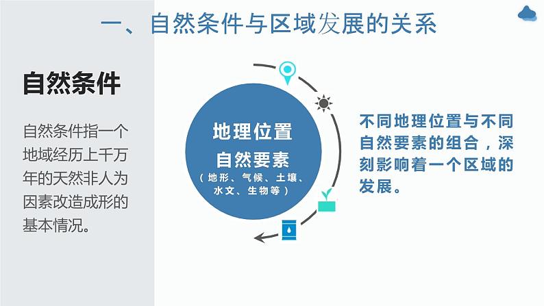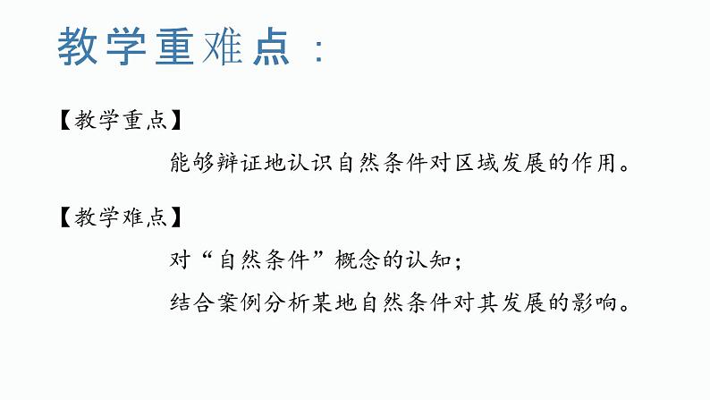 【教学重点】 能够辩证地认识自然条件对区域发展的作用。【教学难点】 对“自然条件”概念的认知; 结合案例分析某地自然条件对其发展的影响。