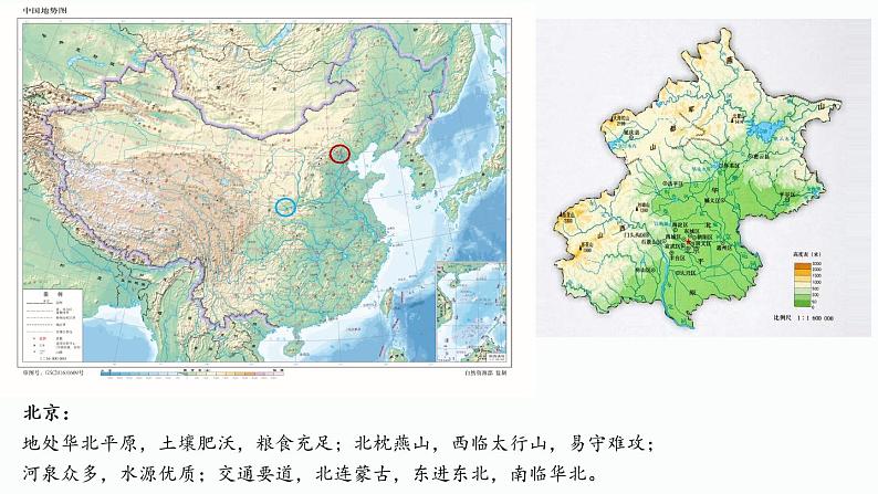 北京:地处华北平原,土壤肥沃,粮食充足;北枕燕山,西临太行山,易守难攻;河泉众多,水源优质;交通要道,北连蒙古,东进东北,南临华北。