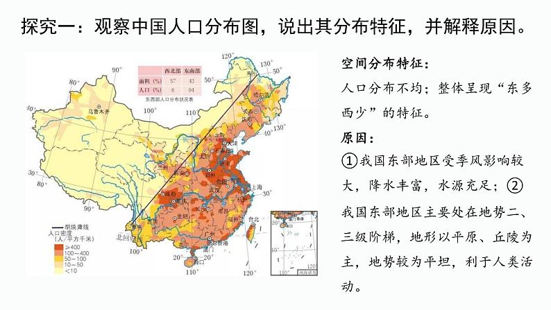 探究一:观察中国人口分布图,说出其分布特征,并解释原因。