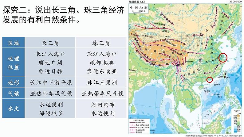探究二:说出长三角、珠三角经济发展的有利自然条件。