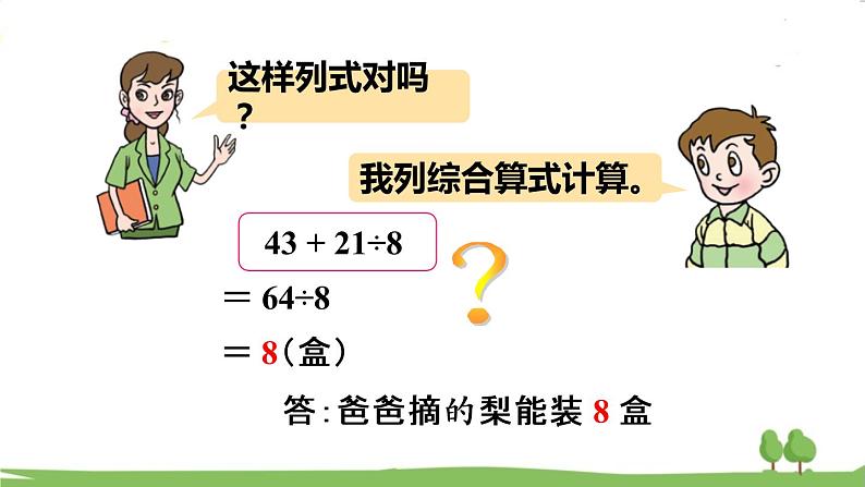 青岛版 (六三制)三年级上册六 采摘节---混合运算备课ppt课件: 这是一份青岛版 (六三制)三年级上册六 采摘节---混合运算备课ppt课件,共29页。PPT课件主要包含了妈妈摘了12箱,每箱5千克,爸爸摘了45千克,你会解答吗试试看,÷5=7箱,-7=5箱,应该先算什么,分步算式,综合算式,12-35÷5等内容,欢迎下载使用。