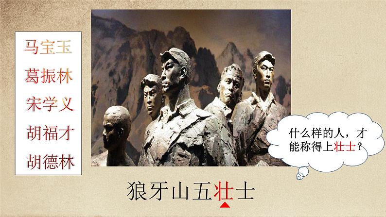 这是一份人教部编版六年级上册第二单元6 狼牙山五壮士一等奖ppt课件,文件包含22《狼牙山五壮士》第一课时课件pptx、22《狼牙山五壮士》第一课时教案docx等2份课件配套教学资源,其中PPT共13页, 欢迎下载使用。