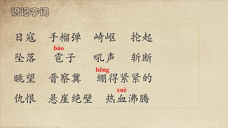 日寇 手榴弹 崎岖 抡起 坠落 雹子 吼声 斩断 眺望 晋察冀 绷得紧紧的仇恨 悬崖绝壁 热血沸腾
