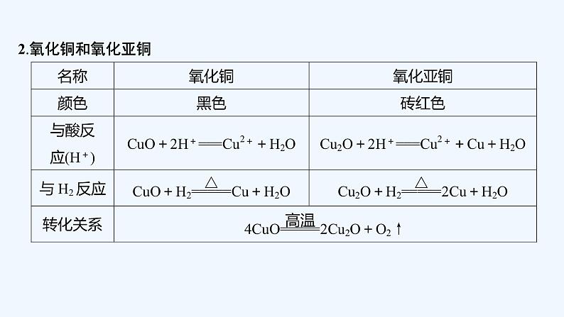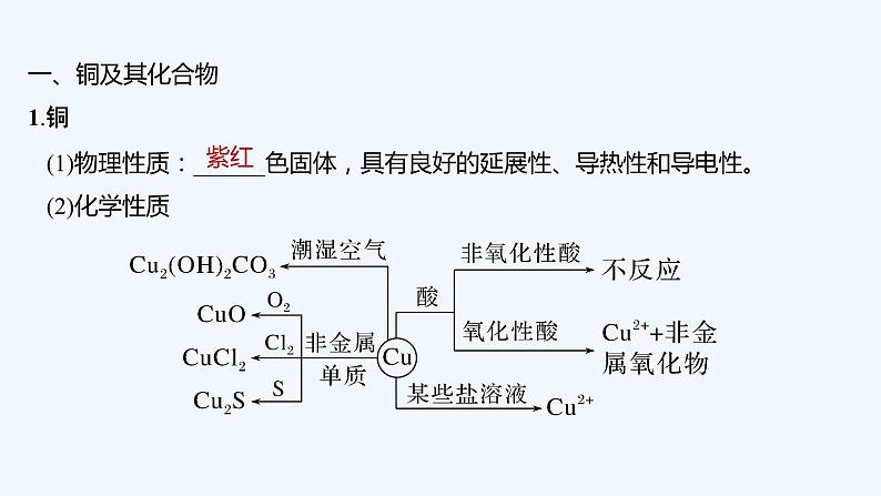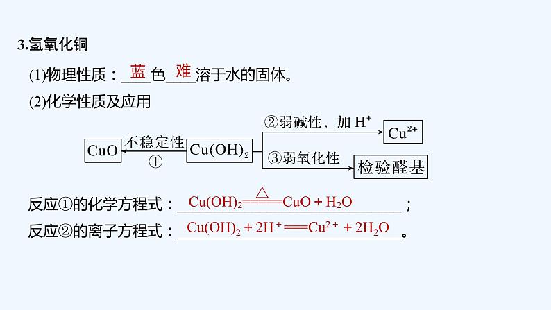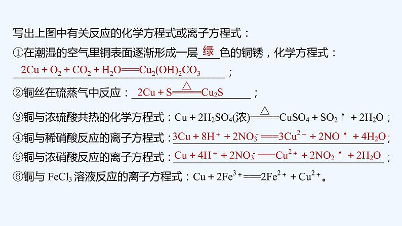 (2)重要反应必练写出下列反应的化学方程式,是离子反应的写离子方程式。①在潮湿的空气里形成铜锈_______________________________________;②铜与氯化铁溶液反应_______________________________________;③碱式碳酸铜受热分解_______________________________________;④碱式碳酸铜与强酸反应__________________________________________。