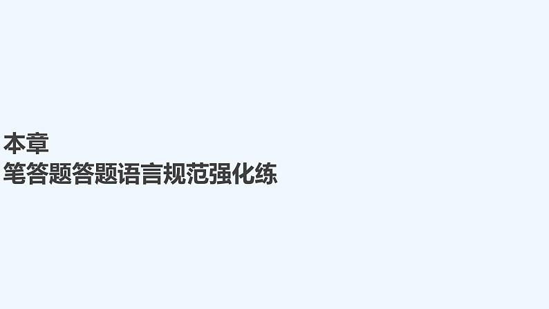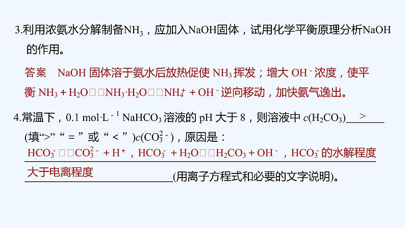 本章笔答题答题语言规范强化练1.在80 ℃时,纯水的pH小于7,为什么? 答案 室温时,纯水中的c(H+)=c(OH-)=10-7 mol·L-1,又因水的电离(H2OH++OH-)是吸热过程,故温度升高到80 ℃,电离程度增大,致使c(H+)=c(OH-)>10-7 mol·L-1,即pH<7。2.甲、乙两瓶氨水的浓度分别为1 mol·L-1和0.1 mol·L-1,则甲、乙两瓶氨水中c(OH-)之比小于(填“大于”“等于”或“小于”)10。请说明理由。甲瓶氨水浓度是乙瓶氨水浓度的10倍,故甲瓶NH3·H2O的电离程度比乙瓶NH3·H2O的电离程度小,所以甲、乙两瓶氨水中c(OH-)之比小于10。3.利用浓氨水分解制备NH3,应加入NaOH固体,试用化学平衡原理分析NaOH的作用。答案 NaOH固体溶于氨水后放热促使NH3挥发;增大OH-浓度,使平衡NH3+H2ONH3·H2ONH+OH-逆向移动,加快氨气逸出。4.常温下,0.1 mol·L-1 NaHCO3溶液的pH大于8,则溶液中c(H2CO3)>(填“>”“=”或“<”)c(CO),原因是:HCOCO+H+,HCO+H2OH2CO3+OH-,HCO的水解程度大于电离程度(用离子方程式和必要的文字说明)。5.(1)若在空气中加热MgCl2·6H2O,生成的是Mg(OH)Cl或MgO,写出相应反应的化学方程式:MgCl2·6H2OMg(OH)Cl+HCl↑+5H2O↑,MgCl2·6H2OMgO+2HCl↑+5H2O↑或Mg(OH)ClMgO+HCl↑。(2)在干燥的HCl气流中加热MgCl2·6H2O时,能得到无水MgCl2,其原因是:在干燥的HCl气流中,抑制了MgCl2的水解,且带走MgCl2·6H2O受热产生的水蒸气,故能得到无水MgCl2。(3)铈(Ce)是地壳中含量最高的稀土元素。在加热条件下CeCl3易发生水解,无水CeCl3可用加热CeCl3·6H2O和NH4Cl固体混合物的方法来制备。其中NH4Cl的作用是:分解出HCl气体,抑制CeCl3水解。6.用沉淀溶解平衡解答下列问题。(1)Mg(OH)2沉淀中混有的Ca(OH)2应怎样除去?写出实验步骤。答案 加入MgCl2溶液,充分搅拌,过滤,沉淀用水洗涤。(2)Ba2+有很强的毒性,胃酸酸性很强(pH约为1),医学上进行消化系统的X射线透视时,服用大量BaSO4仍然是安全的,其原因是:对于沉淀溶解平衡:BaSO4(s)Ba2+(aq)+SO(aq),H+不会影响Ba2+或SO的浓度,平衡不移动。(3)有一种工艺流程是通过将AgCl沉淀溶于氨水,从含金、银、铜的金属废料中来提取银。已知在溶解后的溶液中测出含有[Ag(NH3)2]+,试从沉淀溶解平衡移动的角度解释AgCl沉淀溶解的原因:AgCl固体在溶液中存在沉淀溶解平衡AgCl(s)Ag+(aq)+Cl-(aq),由于Ag+和NH3·H2O结合成[Ag(NH3)2]+。使Ag+浓度降低,导致AgCl的沉淀溶解平衡向着溶解的方向移动。(4)几种离子完全沉淀的pH 物质(25 ℃)Fe(OH)2Cu(OH)2Fe(OH)3完全沉淀时的pH范围≥9.6≥6.4≥3 除去CuSO4酸性溶液中的FeSO4,方法是:首先滴加H2O2,将Fe2+完全转化为Fe3+,再慢慢加入CuO[或Cu2(OH)2CO3],调至pH>3,过滤。7.用0.1 mol·L-1的NaOH溶液分别滴定体积均为10 mL浓度均为0.1 mol·L-1的HCl溶液和CH3COOH溶液,所得pH变化曲线如下:图Ⅱ是NaOH滴定CH3COOH的pH变化曲线,判断的理由是:CH3COOH为弱电解质,0.1__mol·L-1的CH3COOH的pH大于1。8.常考滴定终点的判断方法。(1)用氧化还原滴定法测定TiO2的质量分数:一定条件下,将TiO2溶解并还原为Ti3+,再用KSCN溶液作指示剂,用NH4Fe(SO4)2标准溶液滴定Ti3+至全部生成Ti4+,滴定Ti3+时发生反应的离子方程式为Ti3++Fe3+===Ti4++Fe2+,达到滴定终点时的现象是:当滴入最后一滴标准液,溶液变成红色,且半分钟内不褪色。(2)用标准酸性KMnO4溶液测定某补血口服液中Fe2+的含量时,酸性KMnO4溶液应放在酸式滴定管中,判断滴定终点的方法:滴入最后一滴酸性KMnO4溶液,溶液呈浅红色,且半分钟内不褪色。(3)测定维生素C(C6H8O6)含量的方法:向其溶液中加入过量的碘水,发生反应:C6H8O6+I2―→C6H6O6+2HI,然后用已知浓度的Na2S2O3滴定过量的碘,发生反应:(I2+2S2O===S4O+2I-),可选用淀粉溶液作指示剂,滴定终点的现象是:滴入最后一滴Na2S2O3溶液,蓝色褪去,且半分钟不恢复。(4)已知:Ag++SCN-===AgSCN↓(白色)。实验室可通过如下过程测定所制硝酸银样品的纯度(杂质不参与反应)。①称取2.000 g硝酸银样品,加水溶解,定容到100 mL。溶液配制过程中所用的玻璃仪器除烧杯、玻璃棒外还有100__mL容量瓶、胶头滴管。②准确量取25.00 mL溶液,酸化后滴入几滴铁铵矾[NH4Fe(SO4)2]溶液作指示剂,再用0.100 mol·L-1 NH4SCN标准溶液滴定。滴定终点的实验现象为:溶液变为红色,且半分钟内不褪色。Cl2+H2OH++Cl-+HClO HCO+H2OH2CO3+OH-