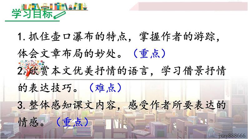 1.抓住壶口瀑布的特点,掌握作者的游踪,体会文章布局的妙处。(重点)2.欣赏本文优美抒情的语言,学习借景抒情的表达技巧。(难点)3.整体感知课文内容,感受作者所要表达的情感。(重点)