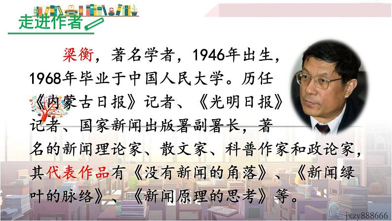 梁衡,著名学者,1946年出生,1968年毕业于中国人民大学。历任《内蒙古日报》记者、《光明日报》记者、国家新闻出版署副署长,著名的新闻理论家、散文家、科普作家和政论家,其代表作品有《没有新闻的角落》、《新闻绿叶的脉络》、《新闻原理的思考》等。