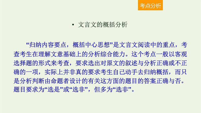 展开文言文的概括分析 “归纳内容要点,概括中心思想”是文言文阅读中的重点,考查考生在理解文意基础上的分析综合能力。这个考点一般以客观选择题的形式来考查,要求选出对原文的叙述与分析正确或不正确的一项,实际上并非真的要求考生自己动手去归纳概括,而只是分析判断由命题者设计的有关这方面的题目的答案正确与否。题目要求为“选是”或“选非”,但多为“选非”。