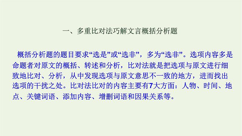 一、多重比对法巧解文言概括分析题 概括分析题的题目要求“选是”或“选非”,多为“选非”。选项内容多是命题者对原文的概括、转述和分析,比对法就是把选项与原文进行细致地比对、分析,从中发现选项与原文意思不一致的地方,进而找出选项的干扰之处。比对法比对的内容主要有7大方面:人物、时间、地点、关键词语、添加内容、增删词语和因果关系等。