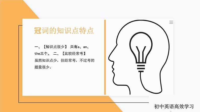 一、【知识点很少】 只有a、an、the三个。 二、【比较经常考】虽然知识点少,但经常考,不过考的 题量很少。