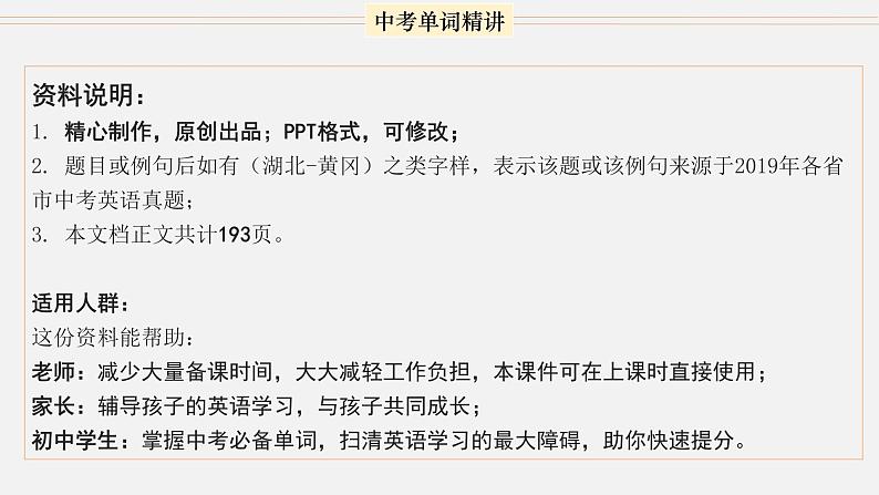 展开资料说明:1. 精心制作,原创出品;PPT格式,可修改;2. 题目或例句后如有(湖北-黄冈)之类字样,表示该题或该例句来源于2019年各省市中考英语真题;3. 本文档正文共计193页。适用人群:这份资料能帮助:老师:减少大量备课时间,大大减轻工作负担,本课件可在上课时直接使用;家长:辅导孩子的英语学习,与孩子共同成长;初中学生:掌握中考必备单词,扫清英语学习的最大障碍,助你快速提分。