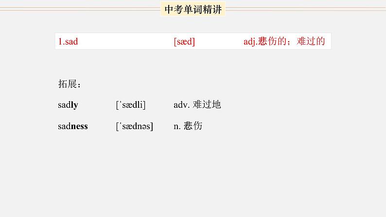 1.sad[sæd] adj.悲伤的;难过的拓展:sadly [ˈsædli] adv. 难过地sadness [ˈsædnəs]n. 悲伤
